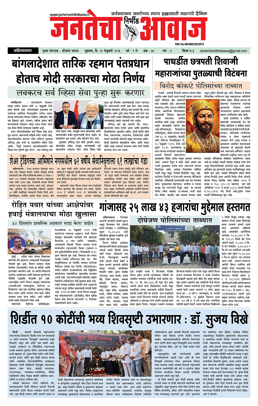 Jantecha Aawaj February 20, 2026 Ahilyanagar-maharashtra 1 2 3 4 पृष्ठ 1पृष्ठ 2पृष्ठ 3पृष्ठ 4 × Jantecha Aawaj 1-41-421-431-44 << पहला << 1 >> आखिरी >> Page no 1Page no 2Page no 3Page no 4
